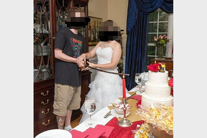 Автор с никнеймом @margnaheglish опубликовал фотографию, на которой жених и невеста позируют рядом с трехъярусным тортом с саблей в руках. На размещенном кадре женщина запечатлена в пышном подвенечном платье с открытыми плечами, которое украшено кружевом. Виновника торжества, в свою очередь, сфотографировали в повседневных футболке и шортах.